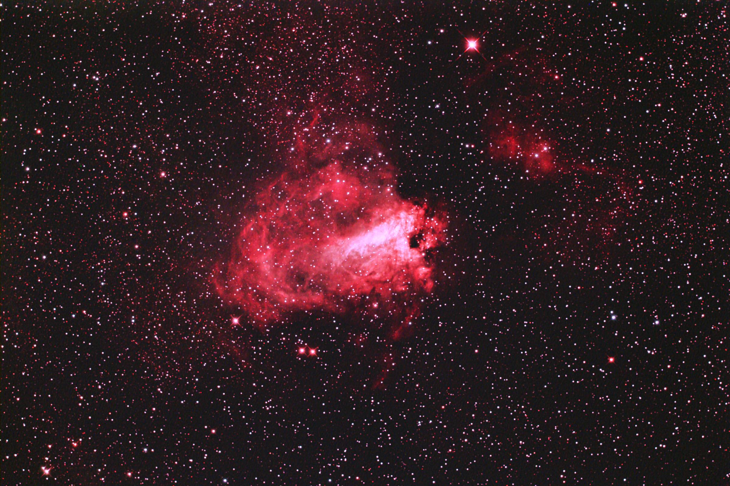 | 撮影メモ | いて座にあるM17(NGC6618)オメガ星雲をEOS 6DとGS-200RCで撮影しました。 撮影時期が遅くなり、気温も高めだったためノイズが多少目立ちますし、淡い星雲の写りもいまひとつです。 シャープレスカタログではSh2-45です。GumカタログではGum 81、RCWカタログではRCW 160です。 (視野角は75.8.'x.50.6') 原版の約44%の大きい画像はこちらです。(Large size image is here) |