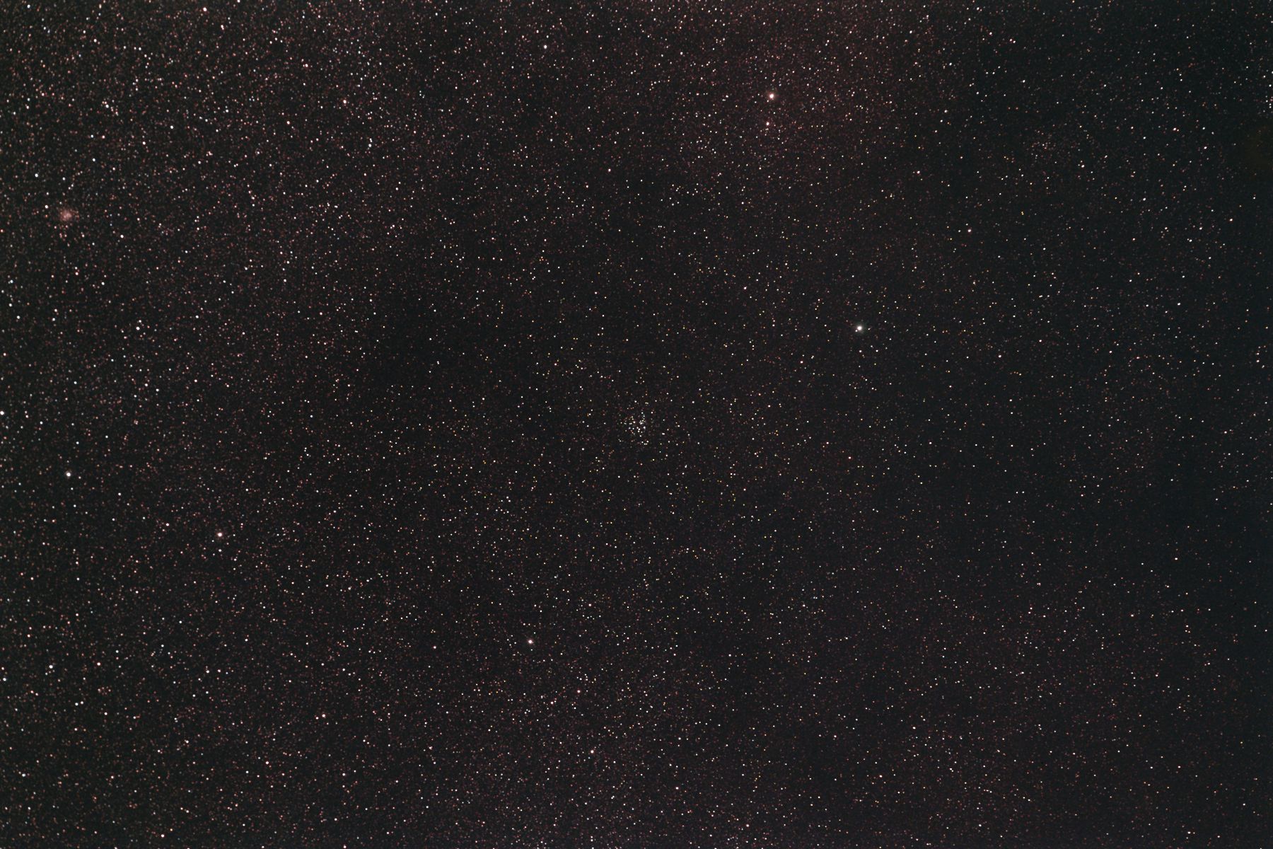 | 撮影メモ | たて座の散開星団M26周辺をOrionの80mm屈折を使ってフルサイズで撮影しました。 M26はたて座のM11の南側にある小さな散開星団です。また左上に少し赤っぽく写っているのはNGC6712球状星団(8.2等、7.2')です。 2枚目は1枚目の原版を約44%にリサイズしてM26の中心部分をトリミングしたものです。 (1枚目の視野角は256'x171') 原版の約1/3の大きい画像はこちらです。(Large size image is here) |