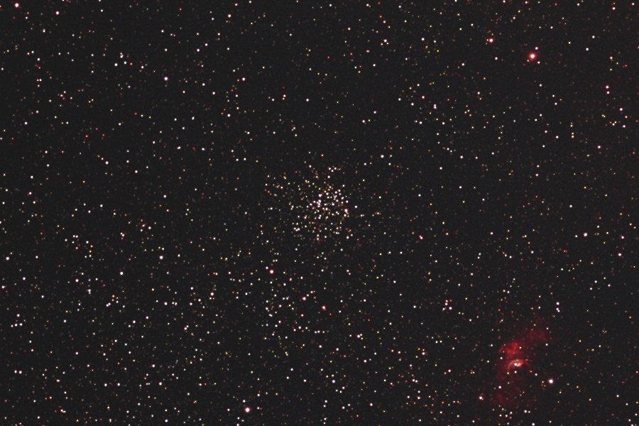 | 撮影メモ | カシオペヤ座の散開星団M52周辺をOrionの80mm屈折を使ってフルサイズで撮影しました。 M52はカシオペヤ座とケフェウス座の境界近くにある星団です。またM52の西側(右側)に見える2つの散光星雲はNGC7635とNGC7538、右下の小さな散開星団はNGC7510:(7.9等 4.0' )です。 2枚目は1枚目の原版を約44%にリサイズしてM52の中心部分をトリミングしたものです。 (1枚目の視野角は256'x171') 原版の約1/3の大きい画像はこちらです。(Large size image is here) |