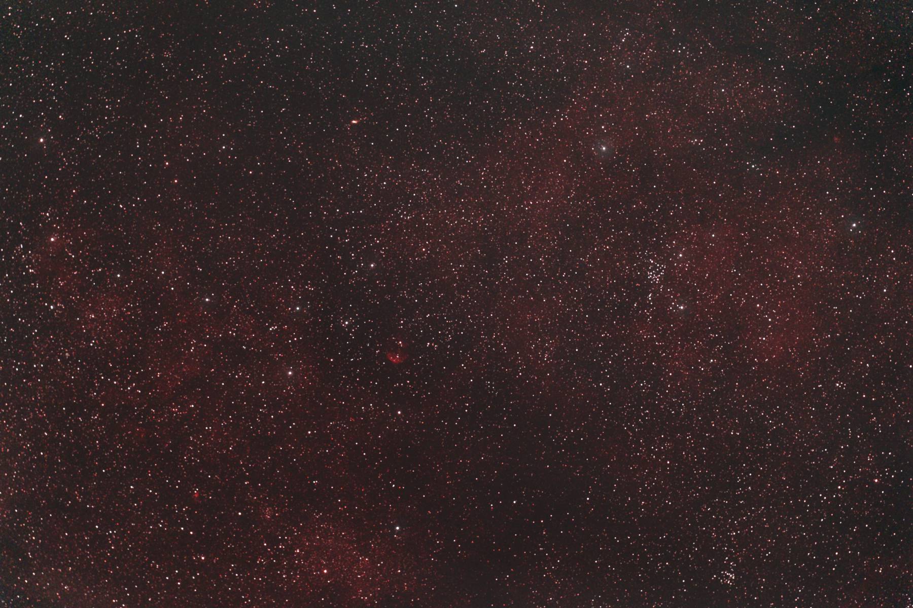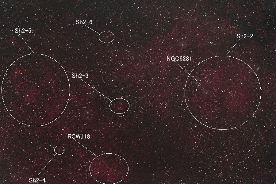 | 撮影メモ | さそり座のSh2-2周辺をOrionの80mm屈折を使ってフルサイズで撮影しました。 視野内にはSh2-2(視直径:60')の他にもSh2-3(視直径:12')、Sh2-4(視直径:5')、Sh2-5(視直径:100')、Sh2-6(視直径:4')、RCW118が写っています。 さそり座の尾の付近なので南中時でも高度は低いですが(写野下端で約13度)、Sh2散光星雲も多く、賑やかな領域です。 (視野角は214'x320') 原版の約1/3の大きい画像はこちらです。(Large size image is here) |
