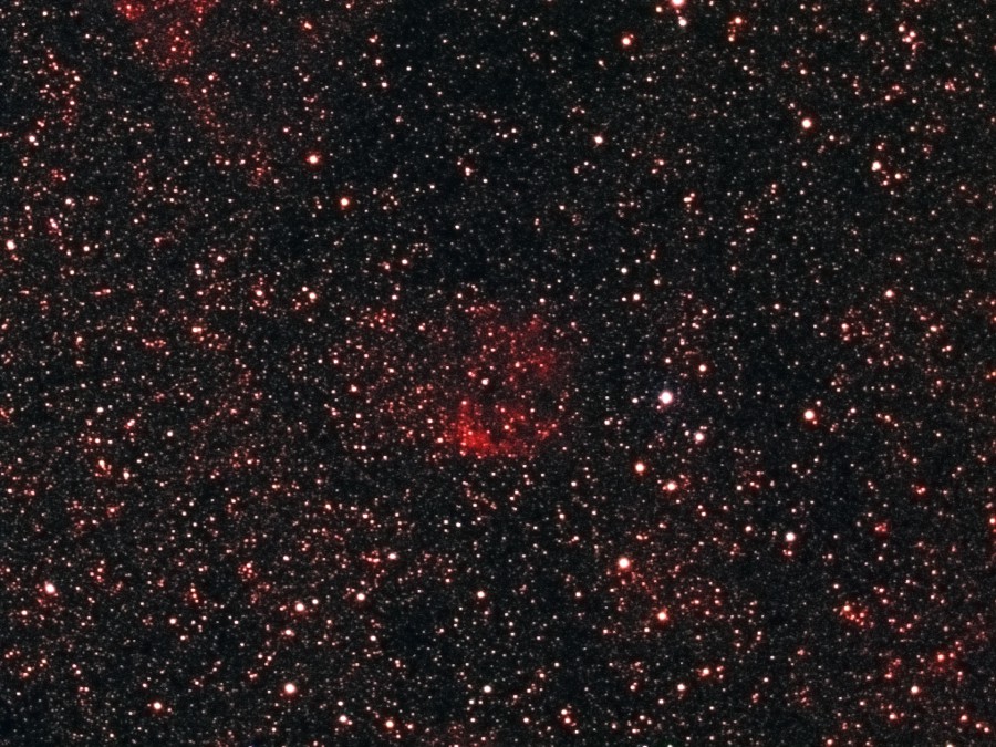 はくちょう座にあるSh2-97をHαフィルターを使って撮影し、HαHαGBで合成しました。 かなり淡い星雲で輝度の高い部分のみしか写っていませんが、内部に亀裂のように入った暗黒帯が確認できます。(視野角は77'x58') 大きい画像はこちらです。(Large size image is here) |