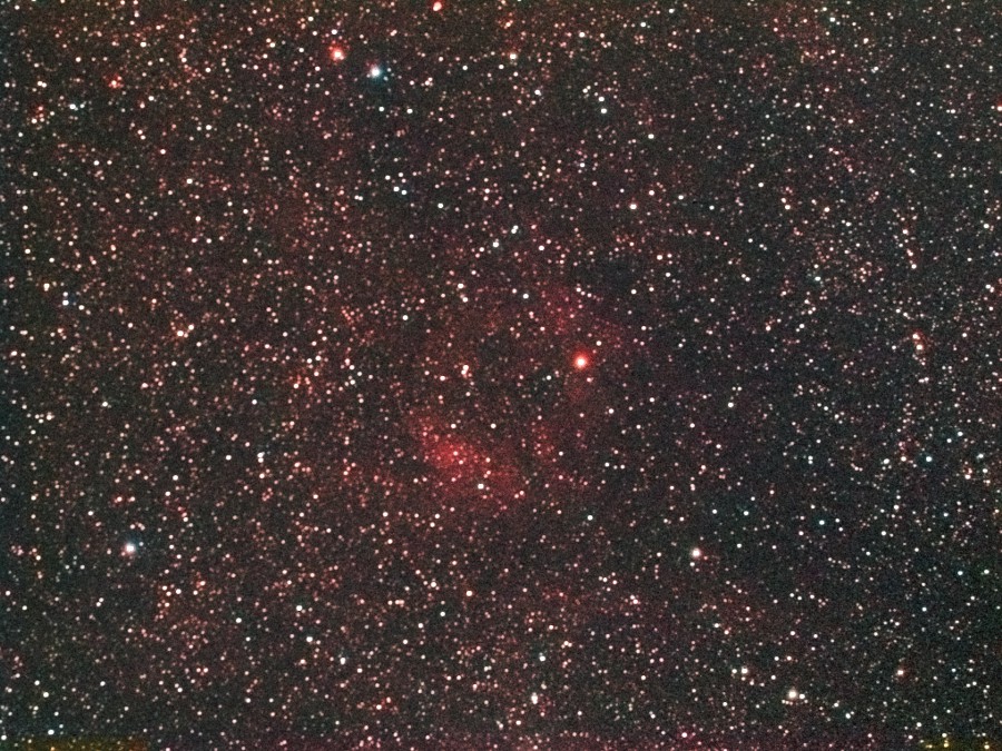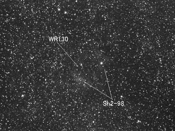 はくちょう座にある散光星雲ををOrionの80mm屈折に0.6xReducerを使用しBJ-32L冷却CCDにて撮影しました。 ドーナツ状に見える星雲がSh2-98です。 中心に付近にある星がWR130(ウォルフ=ライエ星)として知られています。 (視野角は77'x58') 大きい画像はこちらです。(Large size image is here) |