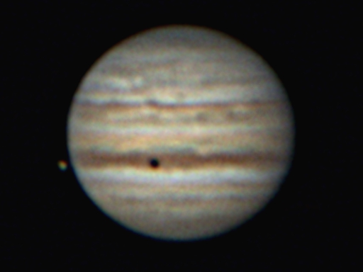 すぐ左の衛星はイオ Io (I)光度 5.0等で木星本体にも黒い影を落としています。