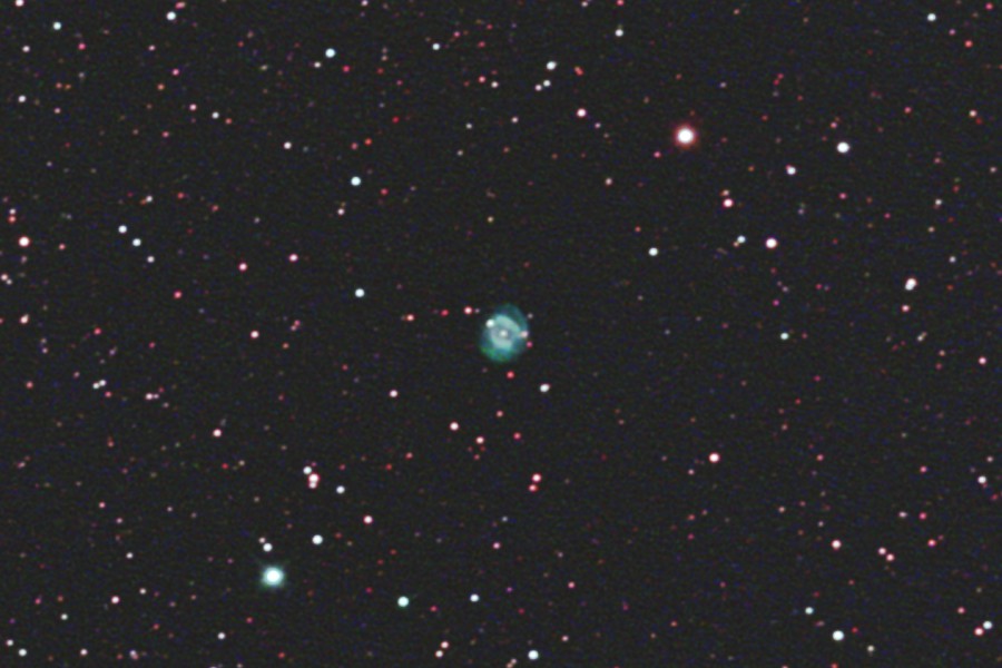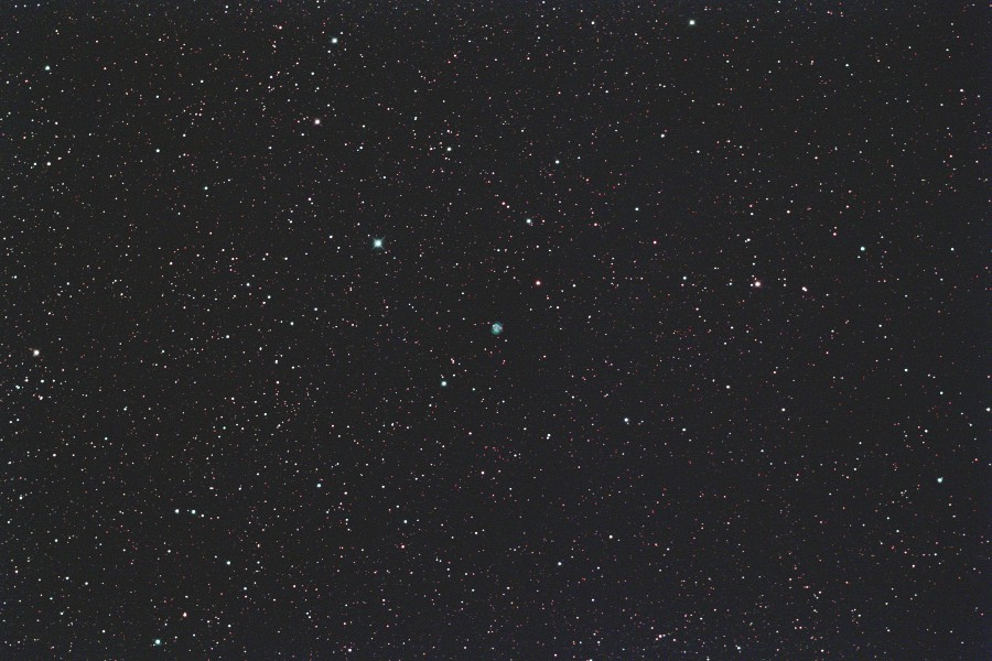 わし座にあるNGC6804惑星状星雲をGS-200RCとEOS 6Dを使用して撮影しました。 サイトロンのDual BPフィルターを使用しました。 青緑色の綺麗な星雲ですが、ドーナツ状の星雲をさらに淡い星雲が取り囲んでいます。 2枚目の画像は原版を70%にリサイズしての中心部分をトリミングしたものです。 (1枚目の視野角は75.8.'x.50.6') 原版の約44%の大きい画像はこちらです。(Large size image is here) |