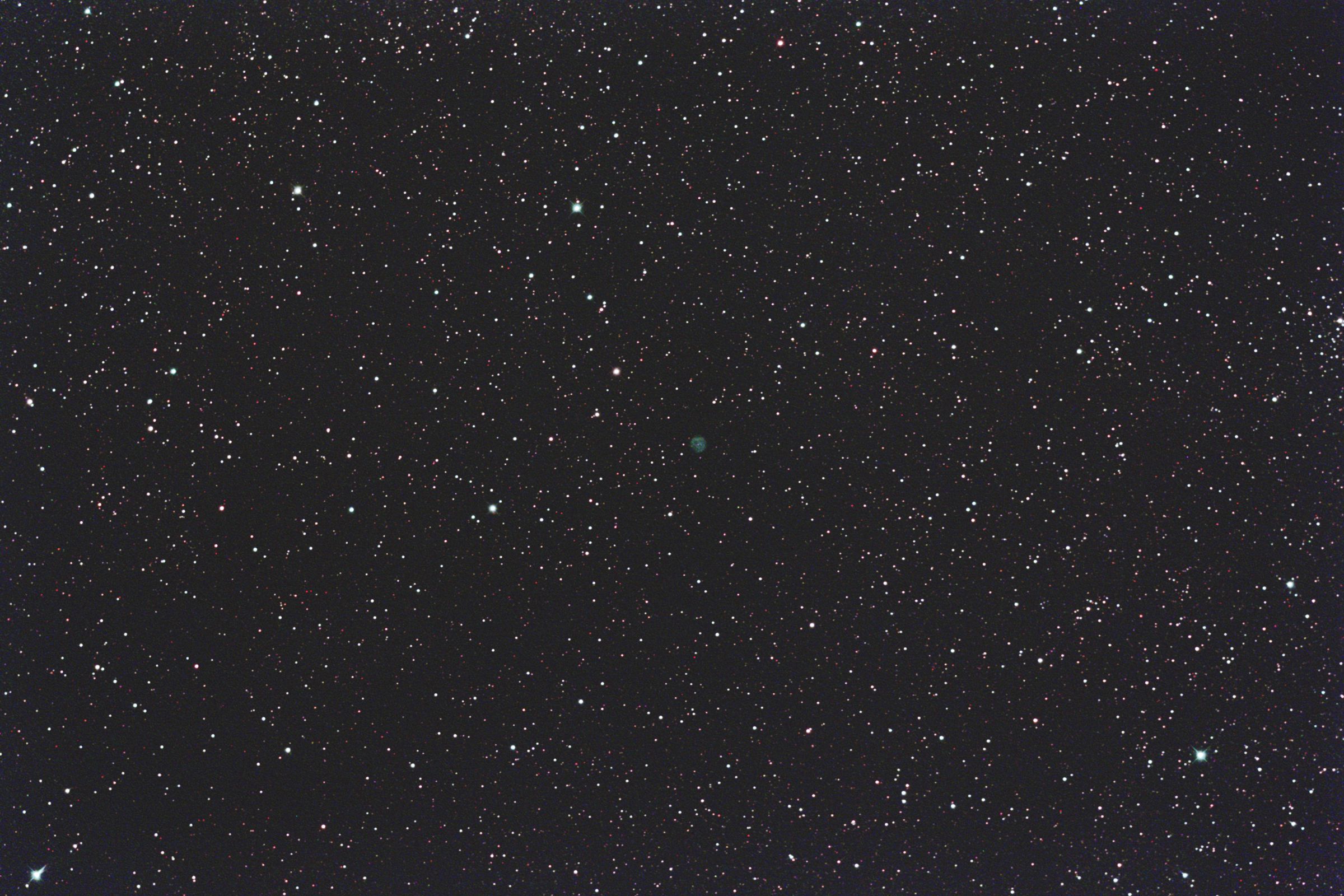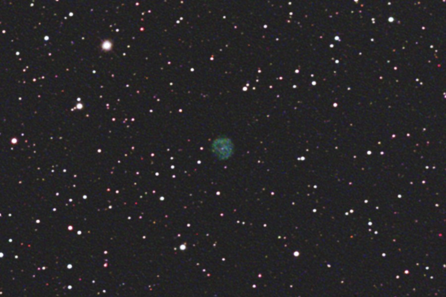 こぎつね座にあるNGC6842惑星状星雲をGS-200RCとEOS 6Dを使用して撮影しました。 サイトロンのDual BPフィルターを使用しました。 青緑色の少し歪な円形の星雲です。 2枚目の画像は原版を70%にリサイズしての中心部分をトリミングしたものです。 (1枚目の視野角は75.8.'x.50.6') 原版の約44%の大きい画像はこちらです。(Large size image is here) |