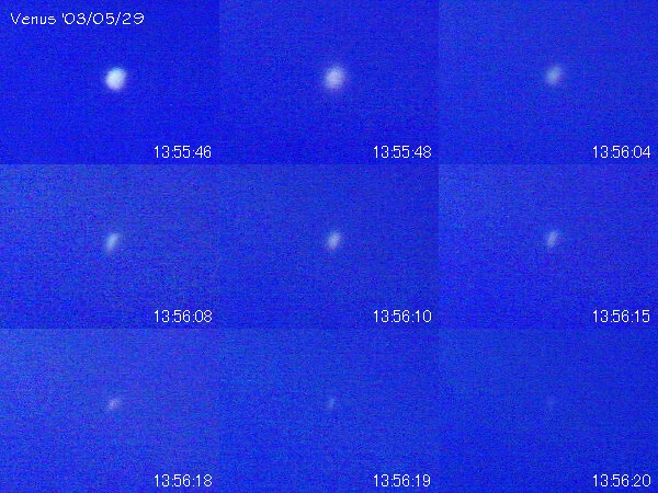| 撮影メモ | 月齢27.7の細い月に隠される金星食の潜入の様子をスライドショーおよび組画像にしました。 日本で13年ぶりの金星食は全国的にほぼ五月晴れに恵まれて見ることが出来ました。 しかし白昼の現象でシーイングが悪く同一インターバルになっていないのが残念です。 月自体は見えていませんが、青空の中の金星があたかも次第に欠けていくように消えていく様子が分かります。 全ての画像をダウンロード後にPLAYボタンで開始。STOPボタンで一時停止します。 |