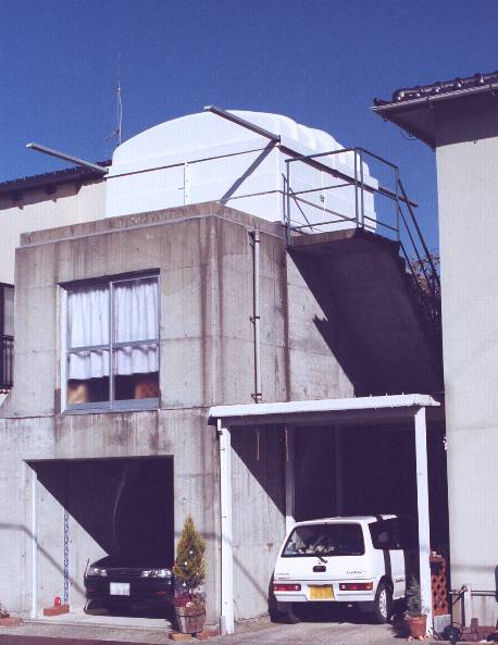 1Fが車庫、2Fが物置兼準備室で屋上にスライディング式ドームがあります。