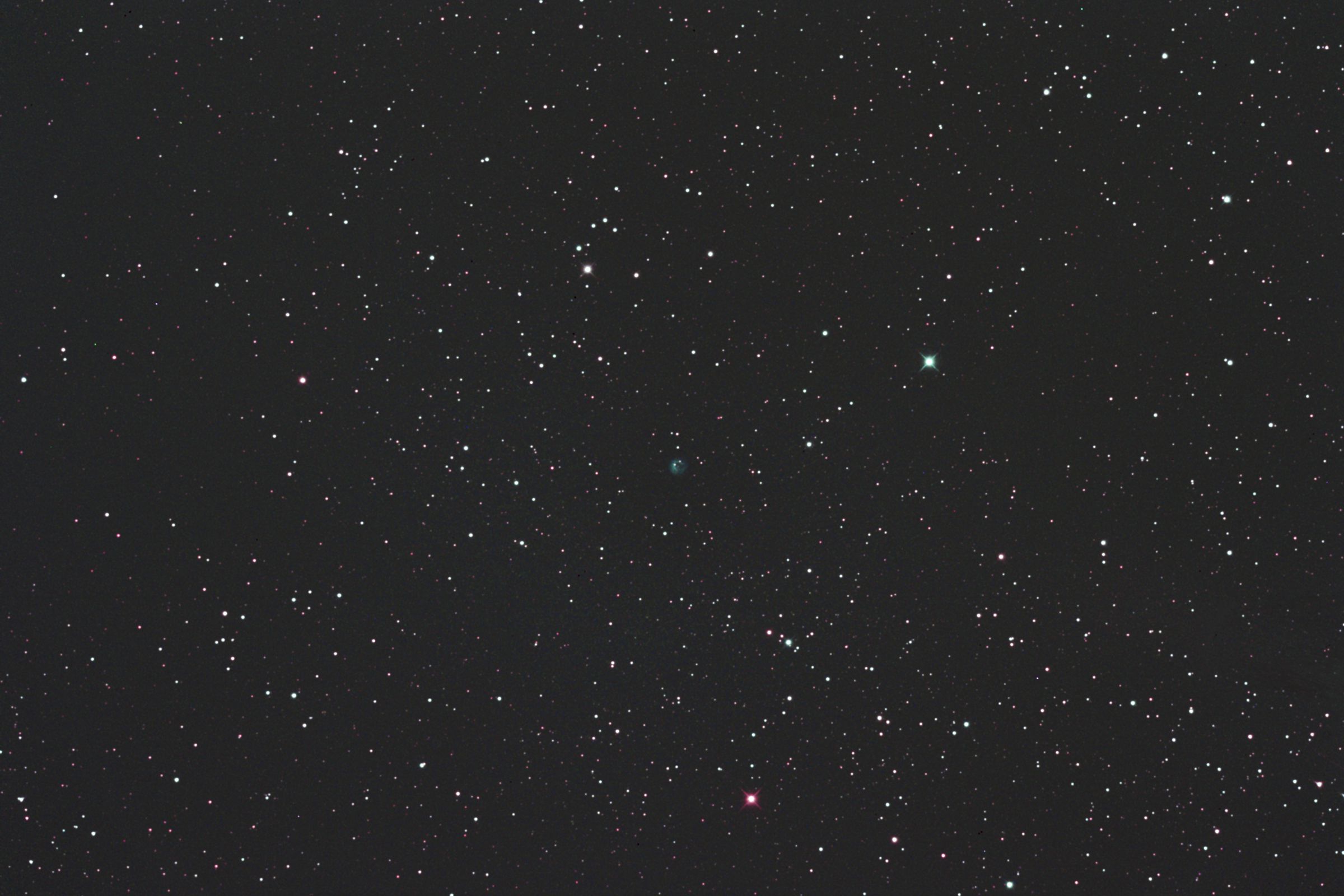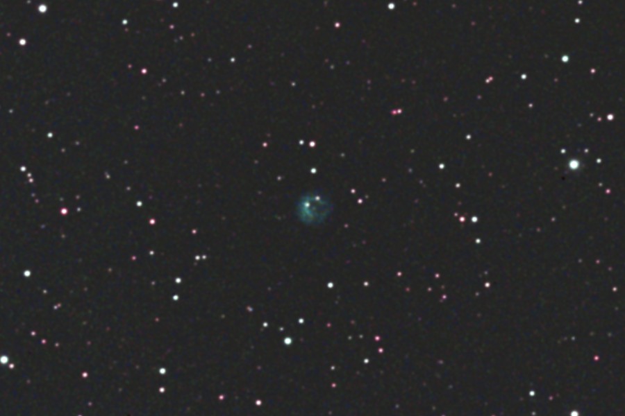 ケフェウス座にあるAbell75惑星状星雲をGS-200RCとEOS 6Dを使用して撮影しました。 サイトロンのDual BPフィルターを使用しました。 Abellカタログの中では特に明るく、また青色が美しい少し不規則な形をした星雲でNGCカタログではNGC7076となっています。 2枚目の画像は原版を70%にリサイズしての中心部分をトリミングしたものです。 (1枚目の視野角は75.8.'x.50.6') 原版の約44%の大きい画像はこちらです。(Large size image is here) |
