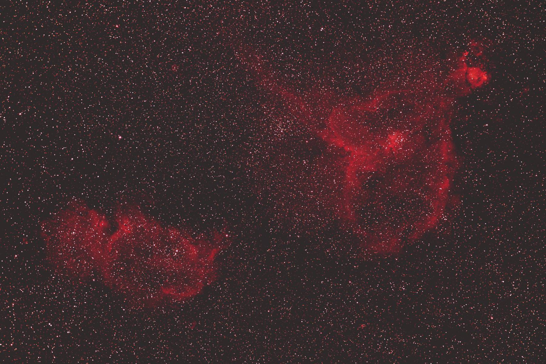 | 撮影メモ | カシオペア座のIC1805からIC1848をOrionの80mm屈折にTeleVueの0.8x レデューサーを付けて撮影しました。 この画角で2つの星雲がほぼ入りました。当観測所では北側が最も光害の影響が大きいのですが、冬の透明度の良さに助けられて何とか撮影出来ました。 シャープレスカタログではそれぞれSh2-190 と Sh2-199となっています。 (視野角は320'x214') 原版の約1/3の大きい画像はこちらです。(Large size image is here) |