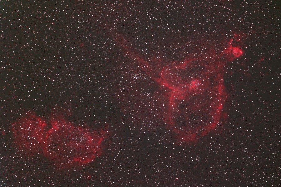 | 撮影メモ | カシオペア座のIC1805からIC1848をOrionの80mm屈折にTeleVueの0.8x レデューサーを付けてEOS 6Dで撮影しました。 北側でまだ早い時間帯だったこともあり、ISO-5000、60s露出でもかぶり気味です。 1年前もSIGHTRON QBP Filterを使って撮影していますが、今回はDual BP Filterを使ってみました。写りの違いはあまりありませんが、こちらのフィルターの方が赤色が抑えられる分すっきりした画像になる気がします。 シャープレスカタログではそれぞれSh2-190 と Sh2-199となっています。 (視野角は320'x214') 原版の約1/3の大きい画像はこちらです。(Large size image is here) |