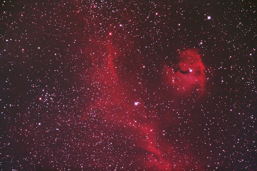 いっかくじゅう座のわし星雲をGS-200RCで撮影しました。 QBPフィルターを使いISO-6400に上げて24枚コンポジットしました。 シャープレスカタログでは鷲の頭の部分がSh2-292、翼の部分がSh2-296です。 星雲全体は入りきりませんが巨大な鷲のくちばしなどの詳細が分かります。 (視野角は94.7'x63.2') 原版の約1/3の大きい画像はこちらです。(Large size image is here) |