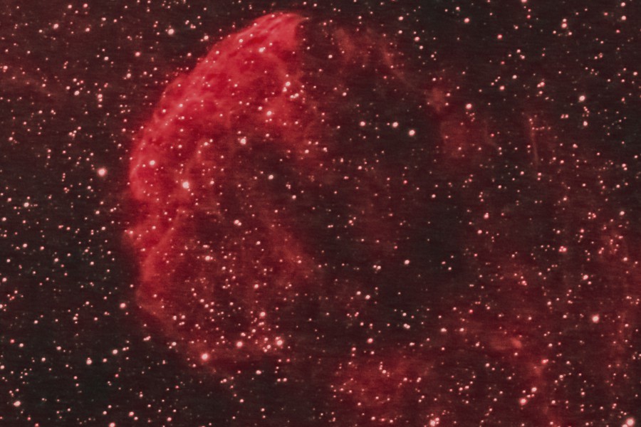 | 撮影メモ | ふたご座の足下にある超新星残骸:くらげ星雲をOrionの80mm屈折にフィールドフラットナーを使用して撮影しました。(視野角は159'x106') 昨年も同一光学系で撮影しましたが、あまり写りが良くなかったため今回7分露出にて再撮影しました。 Photoshop LR5でRAW現像したためノイズがかなり低減出来ました。 冬のこの時期としては珍しく約1ヶ月ぶりに晴れました。 シャープレスカタログではくらげ星雲がSh2-248、μ星付近の星雲がSh2-249で、サイズはそれぞれ50’、80’となっています。 2枚目の画像は原版を1/2にリサイズしてSh2-248の中心部分をトリミングしたものです。 原版の約1/3の大きい画像はこちらです。(Large size image is here) |
