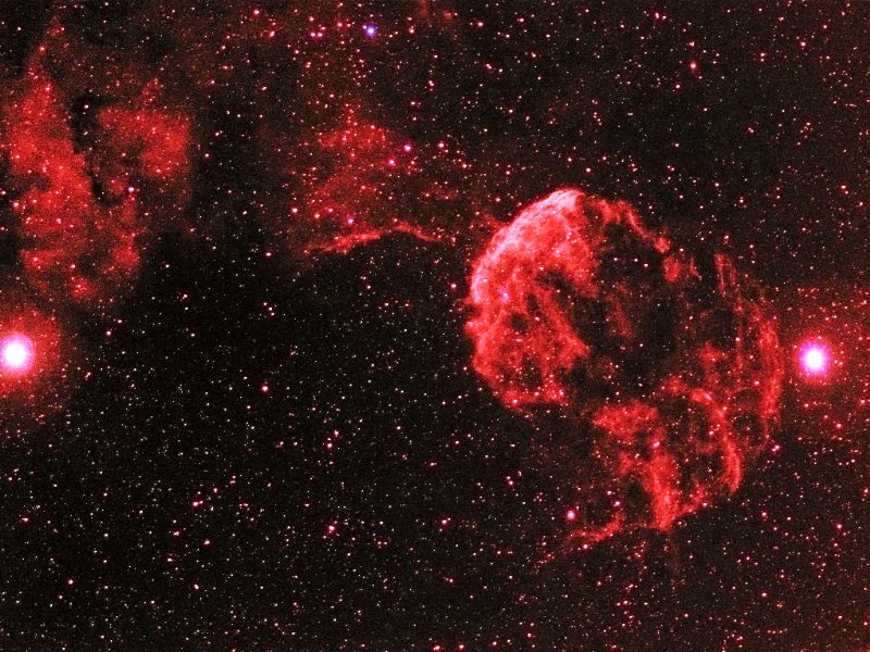 | 撮影メモ | ふたご座の足下にある超新星残骸です。右側がη星(3.3等)、左側がμ星(2.9等)です。 くらげ星雲の東側(左)にも大きな散光星雲が広がっていますが番号はありません。 Hαフィルターを使って180mmレンズで撮影し、HαHαGBでカラー合成しました。 月齢12の明るい月がありGB画像はさすがに月明かりのため露出不足でしたが、Hαフィルターにより淡い部分まで良く写りました。 特にくらげ星雲の南西部は淡いのですが、私たちアマチュアの機材でもここまで写せるようになったのは大変嬉しいことです。 シャープレスカタログではくらげ星雲がSh2-248、μ星付近の星雲がSh2-249で、サイズはそれぞれ50’、80’となっています。(視野角は124'x94') Hαのみの大きな画像はこちらです。(Only Ha image is here) |