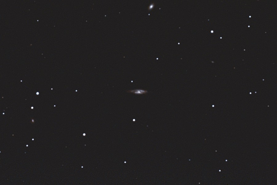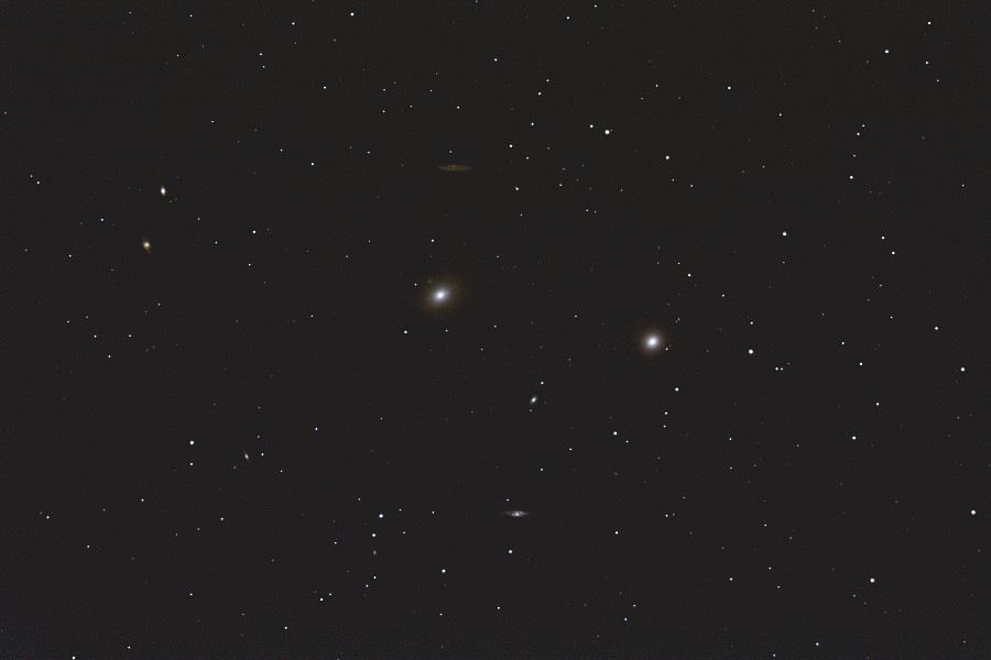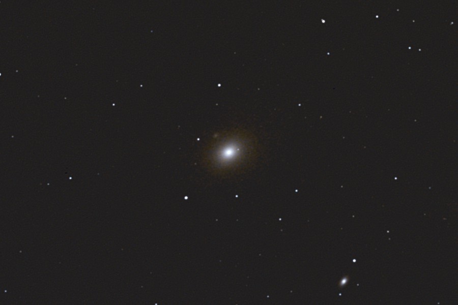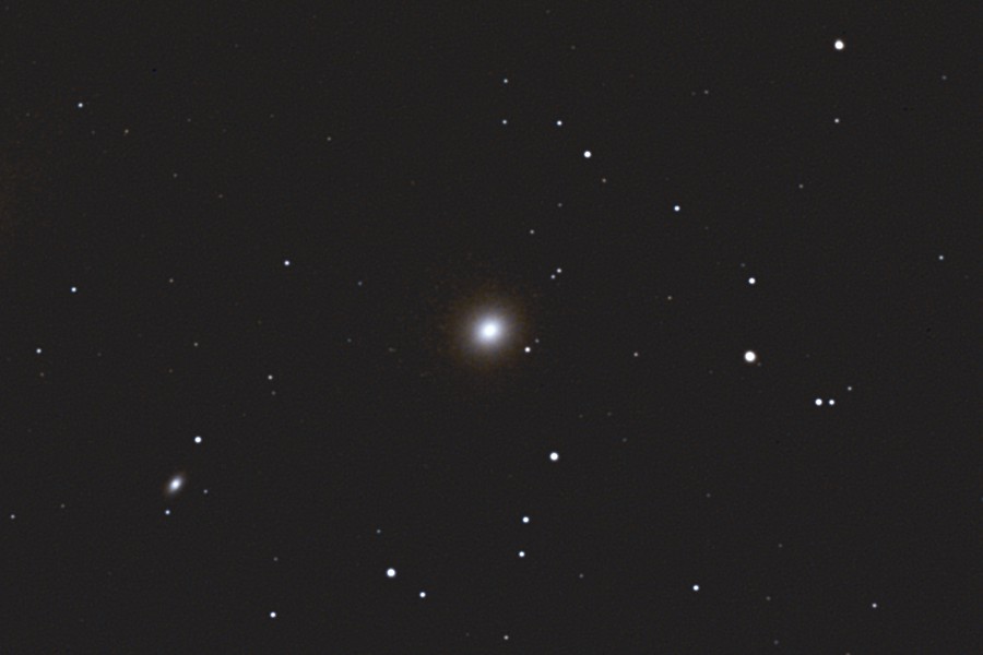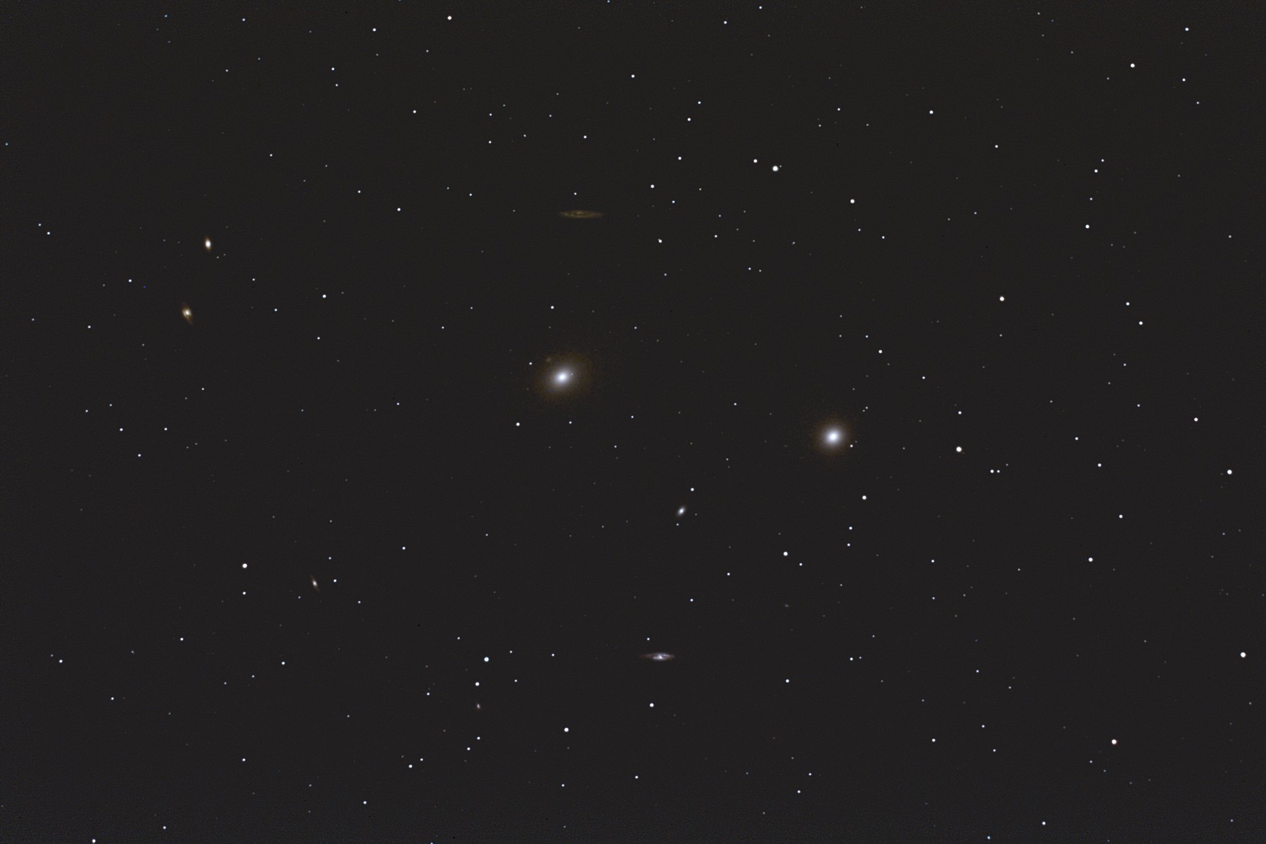 おとめ座のM84とM86銀河をGS-200RCを使用してフルサイズで撮影しました。 画像右側がM84、左側がM86で同じ楕円銀河でも形の違いが分かります。 また画像上側と下側にそれぞれ渦巻き銀河が見えますが、これは上側がNGC4402(Sb型 13.0等 2.0'x0.8') と下側がNGC4388(SBc型 12.0等 5.0'x1.0')です。またこのあたりはおとめ座銀河団の中心にあたるため他にもたくさんの銀河が写りこんでいます。 2枚目〜4枚目の画像は原版を1/2にリサイズしてM84、M86、NGC4402、NGC4388の中心部分をそれぞれトリミングしたものです。 (視野角は75.8.'x.50.6') 原版の約1/3の大きい画像はこちらです。(Large size image is here) |