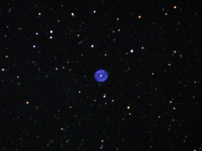 | 撮影メモ | きりん座とカシオペア座の境界近くにある青い楕円形をした惑星状星雲です。中心星が明るく見え、また星雲内部に濃淡があるのがよく分かります。 中心部分をトリミングしました。(拡大率は1倍) |