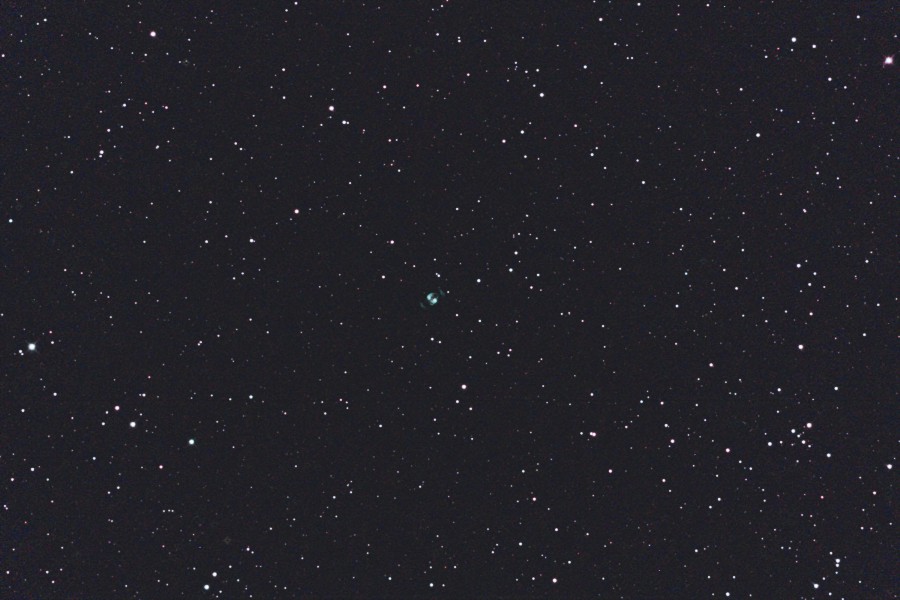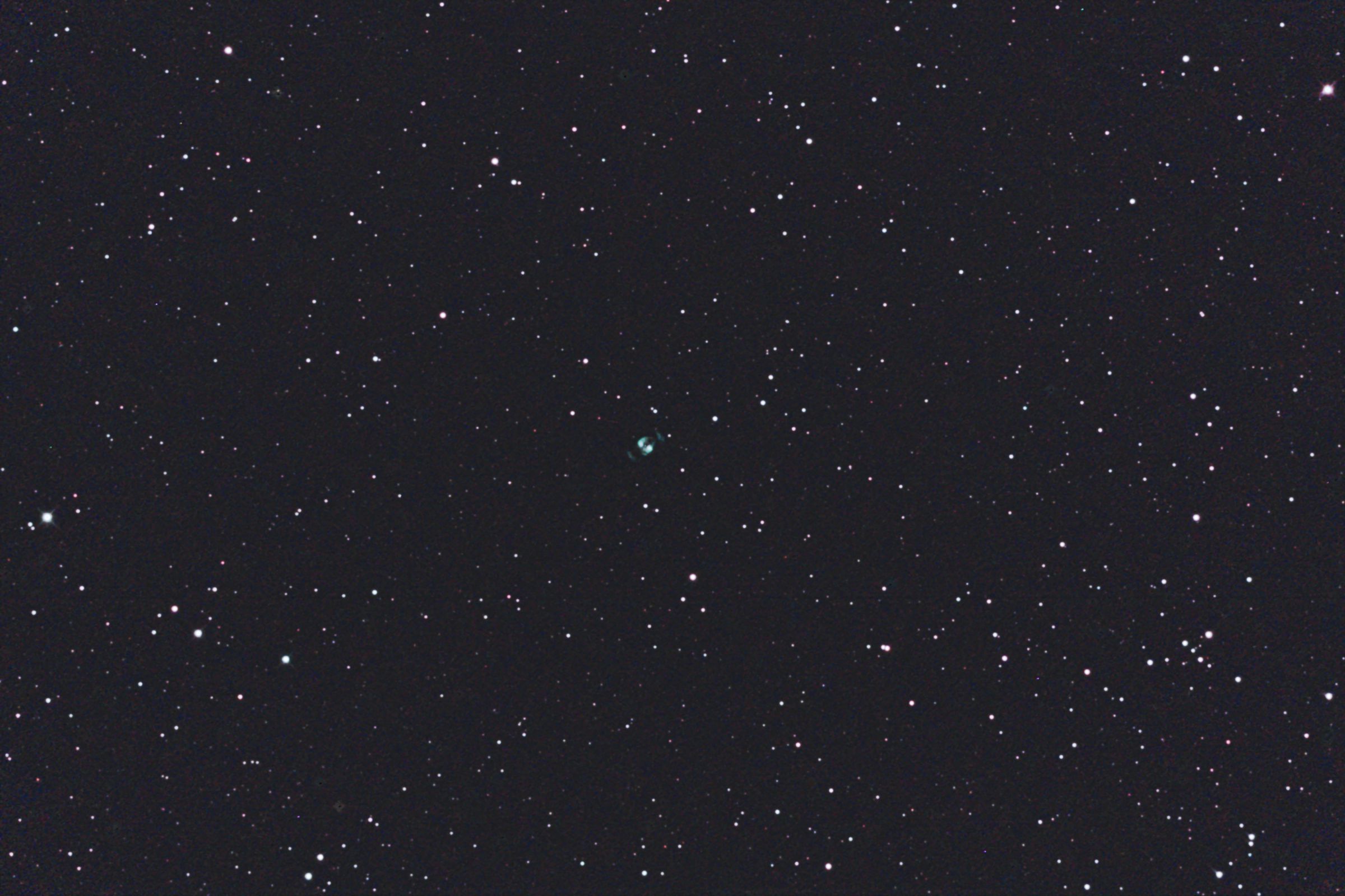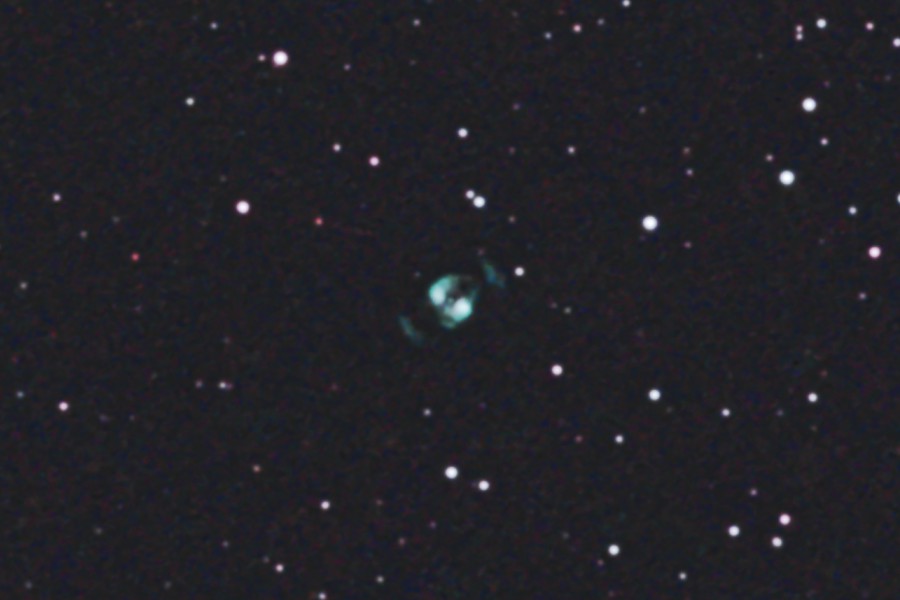 ふたご座にあるNGC2371-72惑星状星雲をGS-200RCとEOS 6Dを使用して撮影しました。南側(下)が2371、北側(上)が2372です サイトロンのDual BPフィルターを使用しました。 時期的に遅くなり少し低空となったため写りは余りよくありませんが、両側の腕もどうにか写っています。 2枚目の画像は原版を70%にリサイズしての中心部分をトリミングしたものです。 (1枚目の視野角は75.8.'x.50.6') 原版の約44%の大きい画像はこちらです。(Large size image is here) |