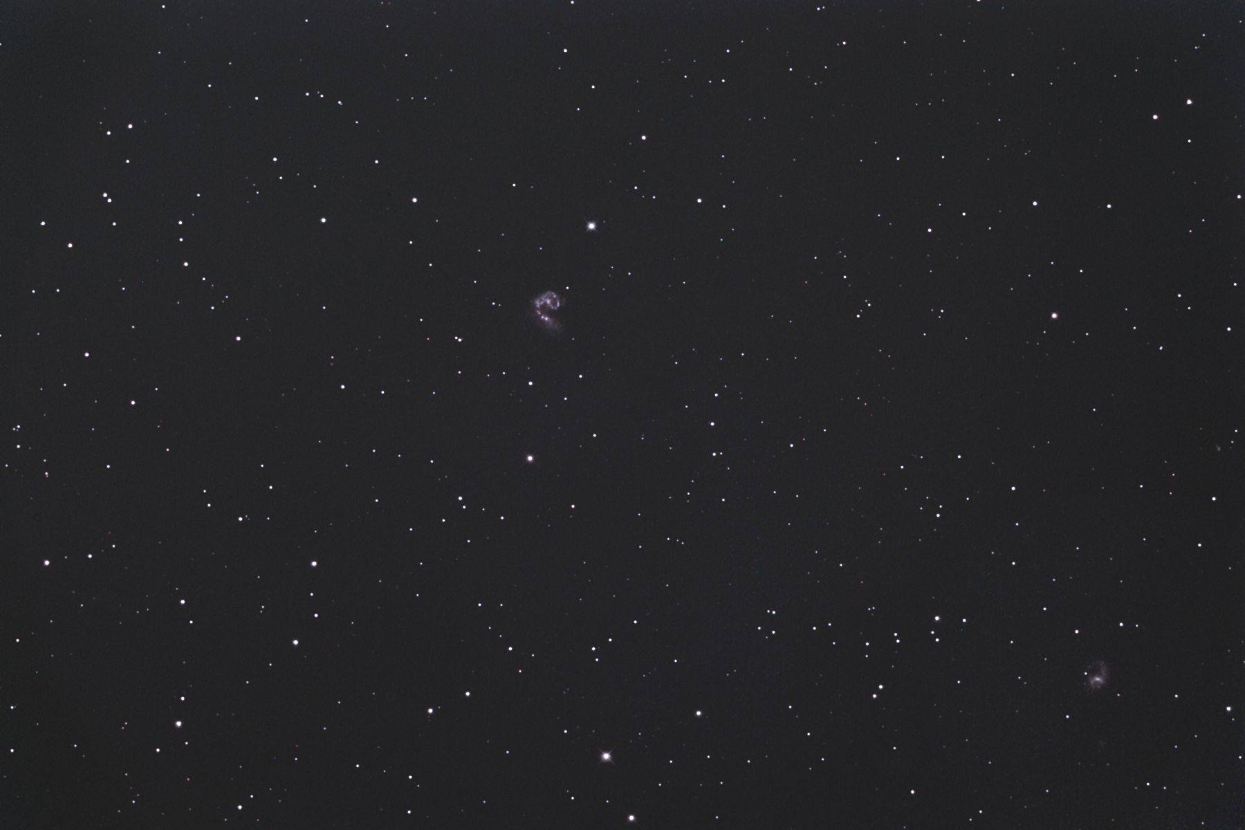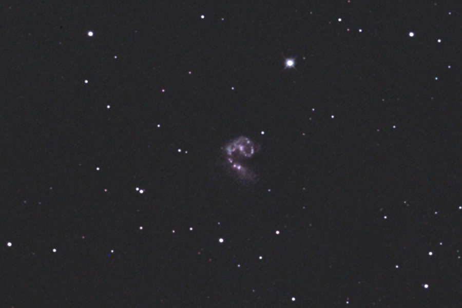 からす座にある衝突銀河NGC4038/4039をGS-200RCを使用して撮影しました。 アンテナ銀河またはリングテール銀河と呼ばれています。 この銀河は互いに潮汐力を及ぼし合うことで2本の細長い腕状の構造が伸びているのが特徴とされていますが、残念ながらこの画像からは確認できません。 撮影時期が遅くなってしまい、低空のため写りも良くありません。 また南西(右下側)にある “おたまじゃくし状”銀河はNGC4027(11.1等 2.0'x1.7' Sc/p型)で、アンテナ銀河と物理的な関連があると思われています。 2枚目の画像は原版を1/2にリサイズしてNGC4038/4039部分をトリミングしたものです。 3枚目の画像は同じくNGC4027部分をトリミングしたものです。 (1枚目の視野角は75.8.'x.50.6') 原版の約1/3の大きい画像はこちらです。(Large size image is here) |