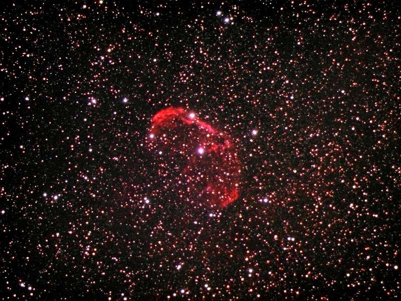 | 撮影メモ | はくちょう座IC.1318の南西側にぽっかり一つだけ浮かんでいる散光星雲です。 弧を描くような形から弧状星雲とも呼ばれています。 月齢20の月明かりがありましたが何とか撮影できました。 この星雲は超新星残骸とも言われています。 |