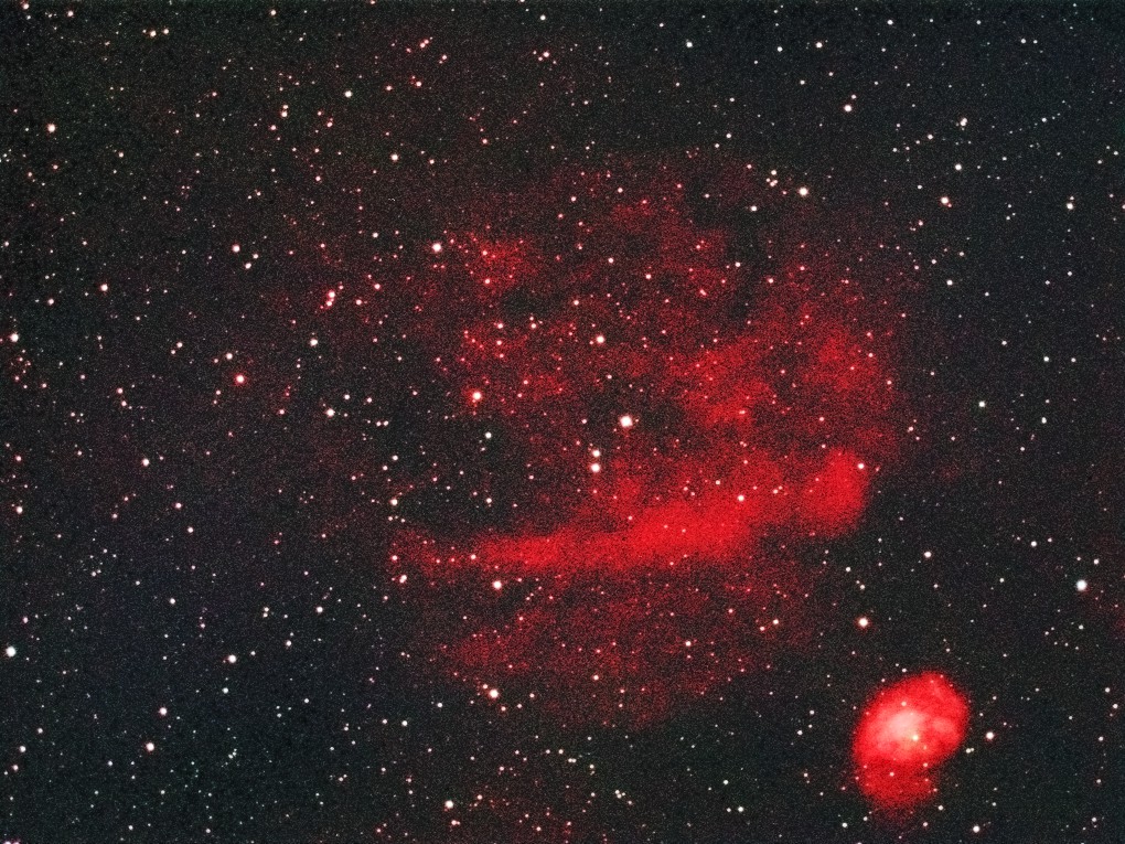 Orionの80mm屈折に0.6xReducerを使用しBJ-32L冷却CCDにて撮影しました。 中央の大きなダルマ状の星雲がSh2-232、右下の小さな楕円形星雲がSh2-235です。 前回BORG76EDでSh2-235を中心に撮影しましたが、Sh2-232が少しはみ出していたので、今回再撮影しました。 Sh2-232は大きさのわりに淡く中央のベルト状の部分が特に明るくなっています。 大きい画像はこちらです。(Large size image is here) |