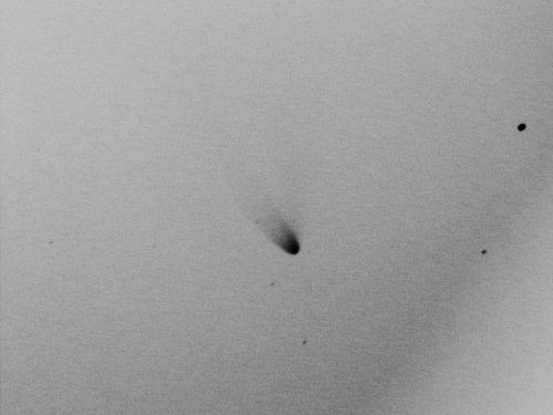 | 撮影メモ | おひつじ座を移動中の宇都宮彗星です。 4月22日の近日点通過後、夕空に見えるようになりました。 4月に入って急激に増光して4/20に3.8等級まで明るくなりました。 可愛らしい尾を持った彗星です。 撮影時の高度は約9°〜7°で、低空のため右下に地上の電線による影が出来てしまいました。 視野の長辺は約1°、右画像はL画像のみを反転したものです。 |